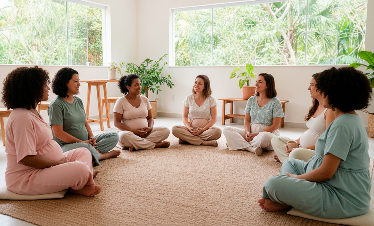 Rodas de conversa, cursos e encontros com outros profissionais e gestantes;